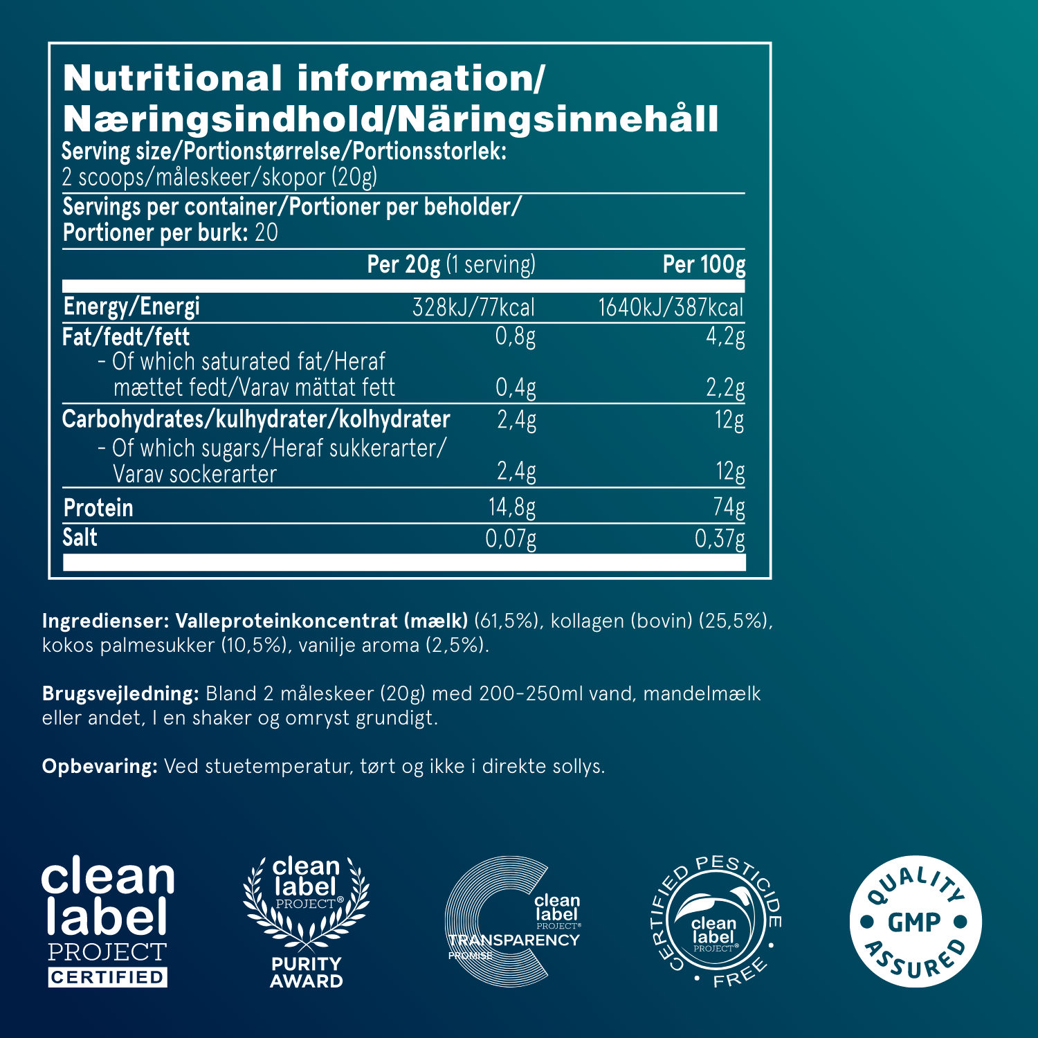 CP2 giver 14g protein per servering fordelt på 2/3dele valleprotein og 1/3 kollagenpeptider. Derudover bruger vi bourbon vanilje smag og kokospalmesukker for at give den gode smag.