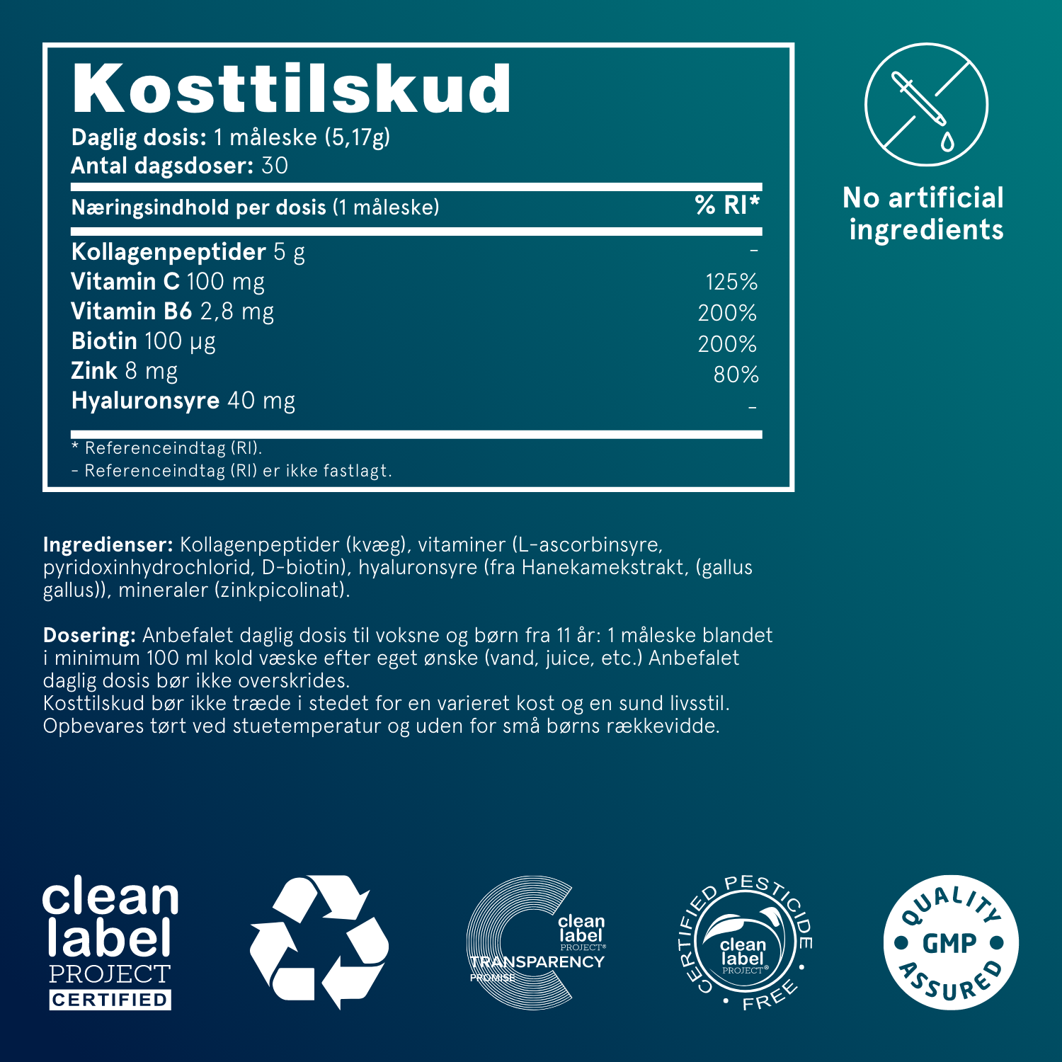 En unik kombination af kollagen blandet med hyaluronsyre, biotin, B6-vitamin, zink og C-vitamin.