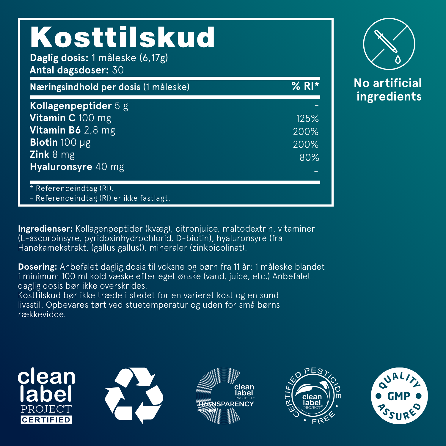 En unik kombination af kollagen blandet med hyaluronsyre, biotin, B6-vitamin, zink og C-vitamin.
