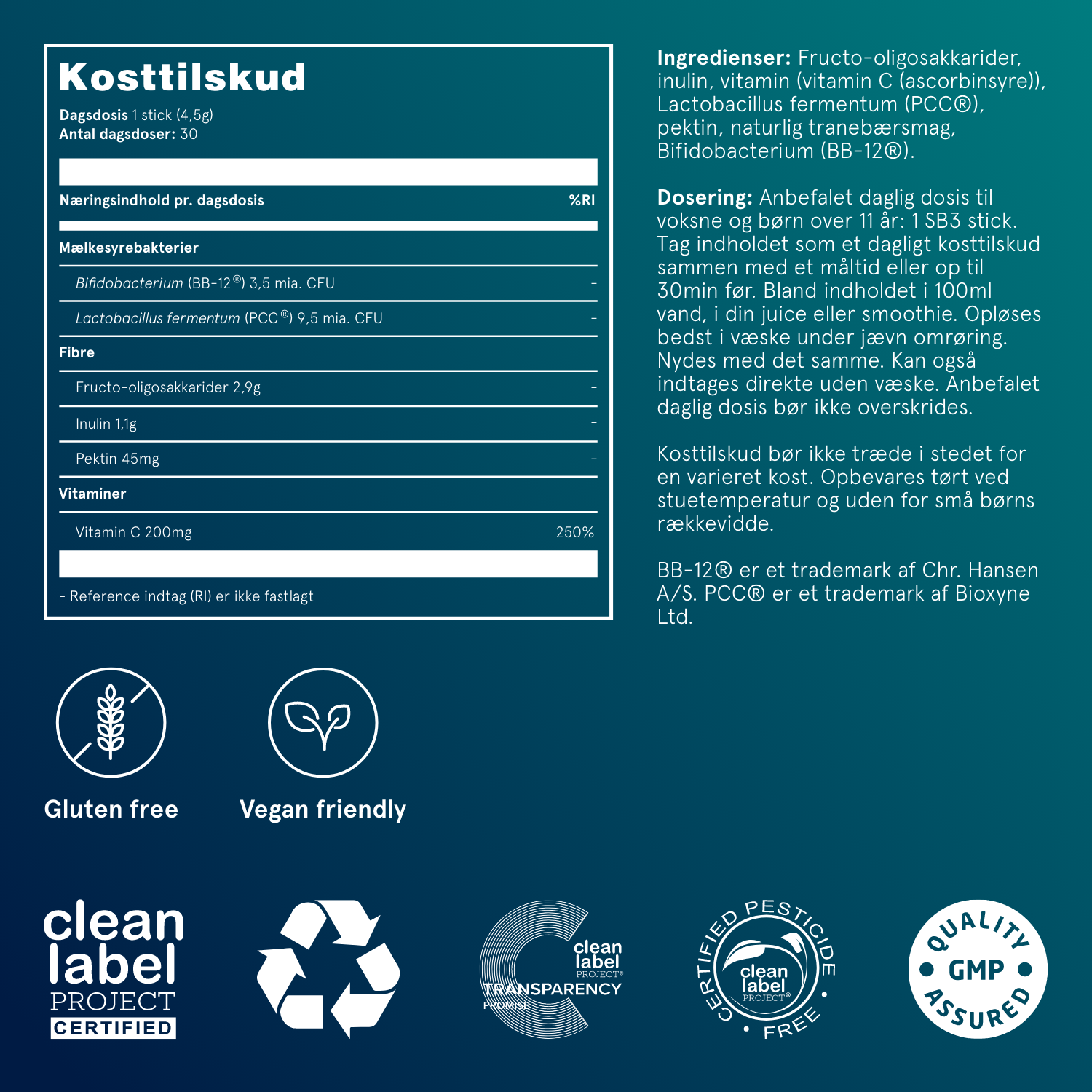 4g fibre i form af FOS, Inulin og pektinbetyder at SB3 er en kilde til fiber