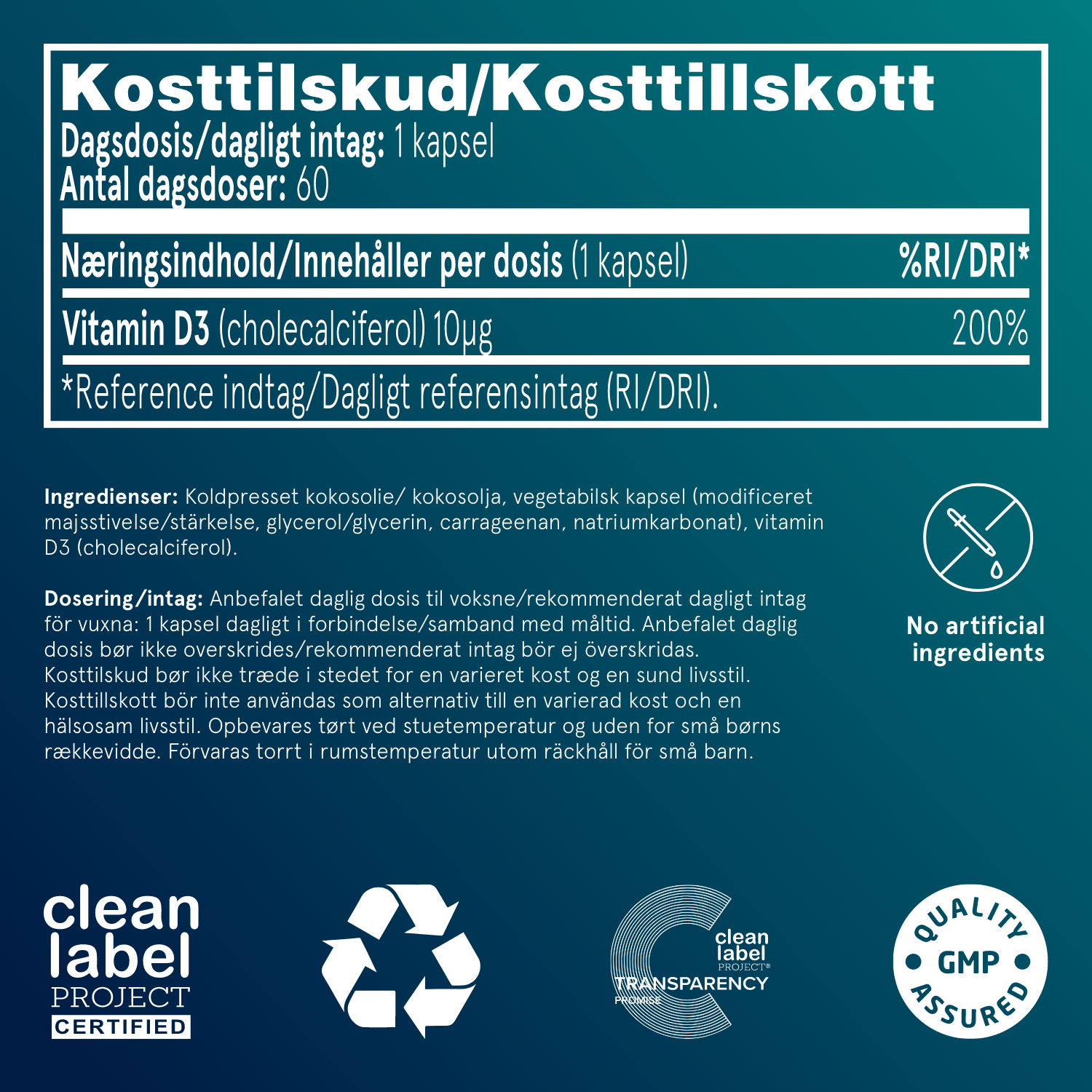 Koldpresset kokosolie blandet med D-vitaminen for bedst muligt optagelig.